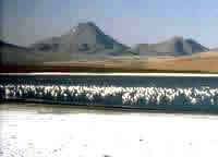 Lake of the Atacama, with its slender, stylized, rose colored flamingoes