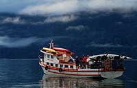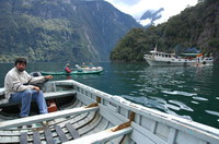 After meeting in Puerto Montt, we drive down the Southern Highway, and cross the Reloncaví estuary to Hornopirén. There we board our 50-foot support vessel and head for Los Ciervos Island. After stopping for lunch in a nice cove, we sail on to Llancahué Island, where we climb into our sea kayaks for instruction and practice. Afterwards, we camp for the night on this island.